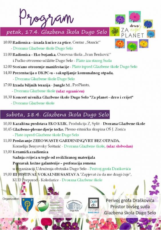 Sajam cvijeća i uređenje okućnica te predavanja o vrtu bez otpada, odvajanju i recikliranju s nizom različitih radionica ovog su vikenda pozivnica zainteresiranima da posjete Dugo Selo i tradicionalnu dugoselsku manifestaciju „Za planet – drvo i cvijet“, u petak 17. i u subotu 18. travnja 2026.