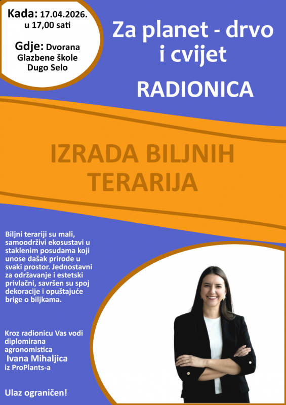 Predavanje je otvoreno i besplatno za sve posjetitelje, dok je ograničen broj polaznika za radionicu izrade biljnih terarija odnosno malih samoodrživih ekosustava u staklenim posudama koji unose dašak prirode u svaki prostor. Navedena radionica održat će se u petak poslijepodne u dvorani Glazbene škole.