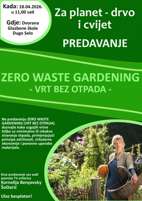 Poznata televizijska vrtlarica Kornelija Benyovsky Šoštarić održat će u subotu u dvorani Glazbene škole predavanje na temu vrta bez otpada (ZERO WASTE GARDENING) odnosno kako uzgojiti vrtne biljke uz minimalno ili nikakvo stvaranje otpada primjenjujući principe održivosti, cirkularne ekonomije i ponovne uporabe materijala.