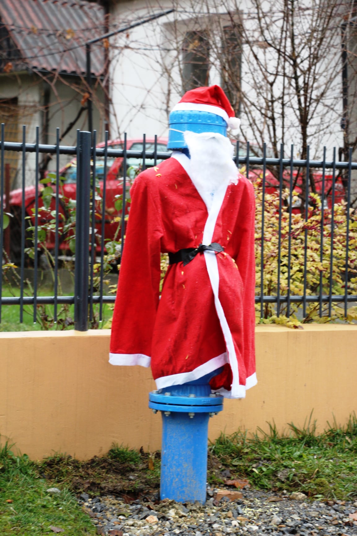 Plava i prilično neugledna hidrantska konstrukcija u odijelu Djeda Mraza s bijelom bradom spremno dočekuje božićne blagdane. Gotovo da je i oživjela! Doduše primijetili smo samo jednog Djeda Mraza i ne znamo hoće li postati trend...i ono što je najbitnije, smije li postati trend?