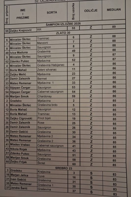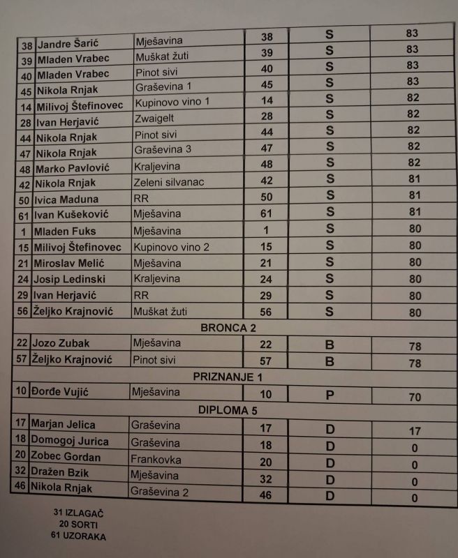 Komisija sastavljena od poznatih enologa prof. dr. sc. Ana Marija Jagatić Korenika predsjednica, dr. sc. Mirela Osrečak, dr. sc. Maja Firšt, mr. sc. Marija Koščević, Vesna Bakota dipl. ing i Mladen Forko dipl. ing. članovi komisije ocijenili su ukupno 61 pristigli uzorak vina. Ocjena stručnjaka je da opća kvaliteta vina bila odlična, tako da je čak 29 uzoraka vina ocjenjeno zlatnim odličjem. Šampion izložbe je rajnski rizling Željka Krajnovića, dok je vino iz gradskog vinograda mješavina osvojila zlato, a kraljevina srebreno odličje.