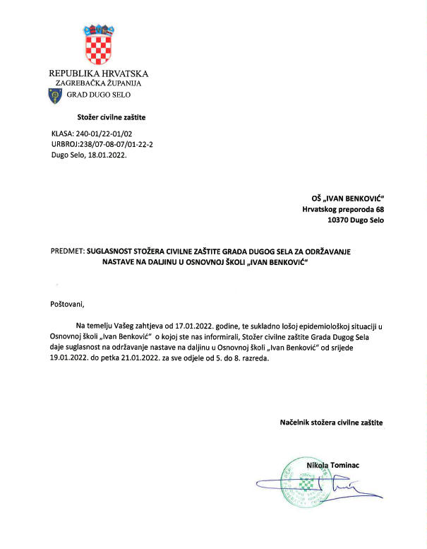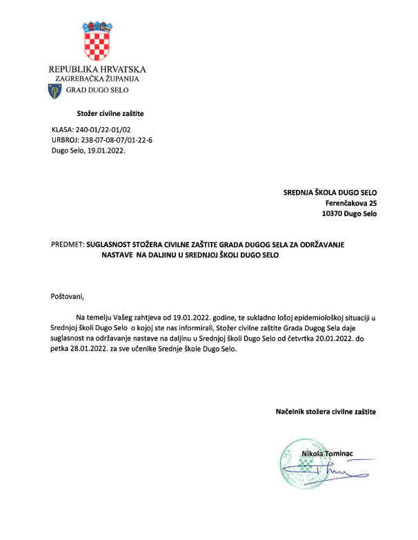 Stožer civilne zaštite Grada Dugog Sela na čelu s načelnikom Nikolom Tomincem s obzirom na pogoršanje epidemiološke slike dao je suglasnost spomenutim školama za organizaciju nastave prema modelu C i modelu B.