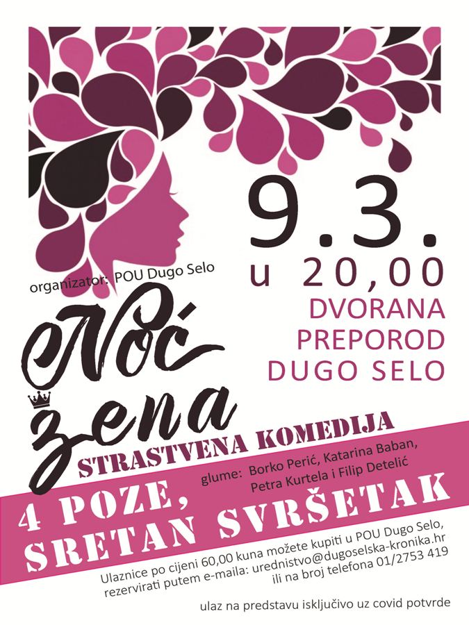 Pučko otvoreno učilište Dugo Selo poziva na predstavu „„4 poze sretan svršetak“ 9. ožujka u Dvorani „Preporod“. Tradicionalan je to način obilježavanja Dana žena pod nazivom "Noć žena" u Dugom Selu. Predstava počinje u 20 sati.