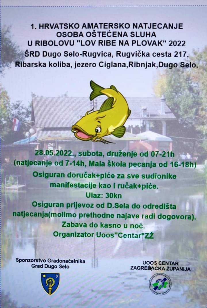Udruga osoba oštećena sluha "Centar" Zagrebačka županija organizira 28. svibnja sportsko natjecanje u ribolovu na jezeru Ciglana u Dugom Selu za osobe oštećena sluha.