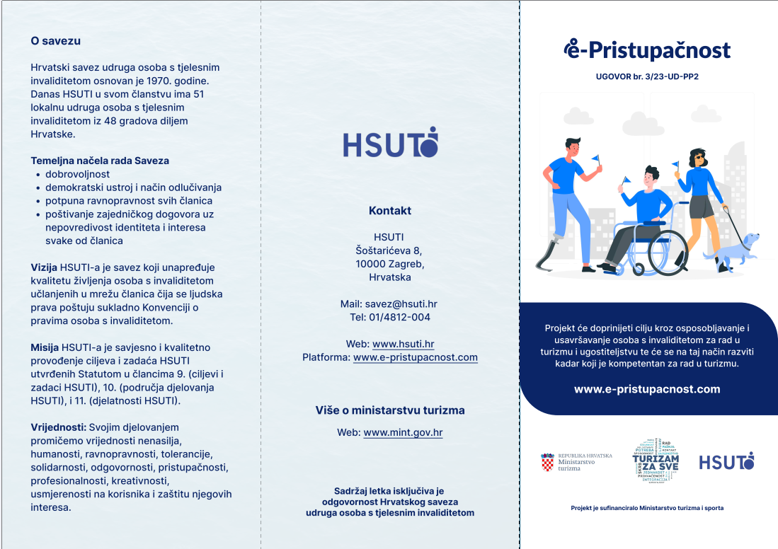 U okviru provedbe odobrenih aktivnosti po projektu ”e-Pristupačnost” HSUTI je izradio digitalni letak o Projektu s ciljem senzibilizacije javnosti o inkluziji osoba s invaliditetom na tržištu rada u turizmu i ugostiteljstvu.