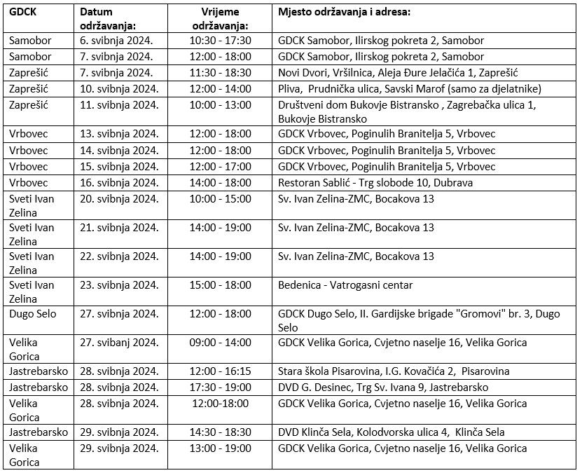 Društva Crvenog križa Zagrebačke županije tijekom svibnja provodit će redovite akcije dobrovoljnog darivanja krvi na više lokacija.