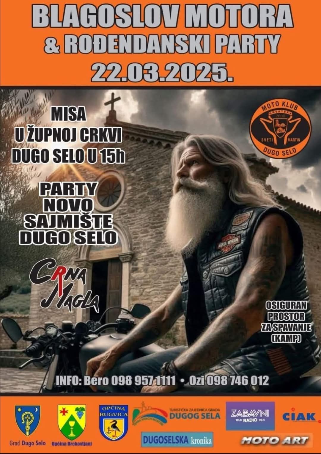 Održat će se blagoslov motora i misa u Župnoj crkvi sv. Martina u Dugom Selu u 15 sati, a u 16 sati slijedi druženje rođendanski party uz grupu Crna magla na gradskom prostoru (novo sajmište).