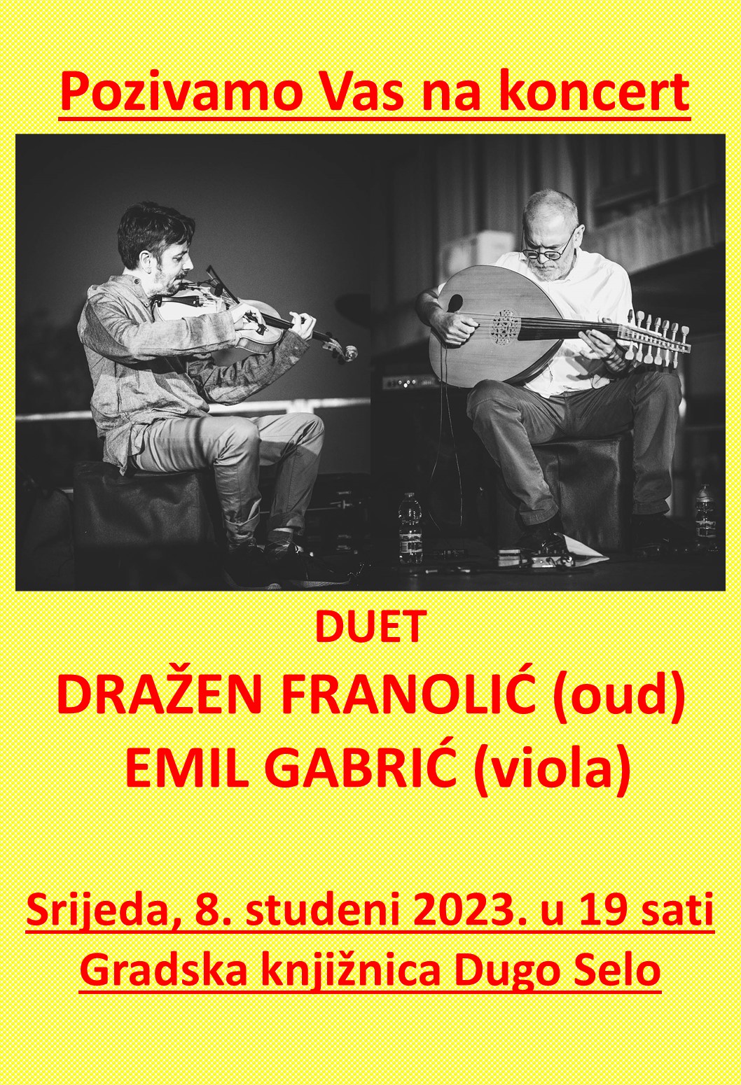 Gradska knjižnica Dugo Selo poziva na izniman glazbeni doživljaj u Gradskoj knjižnici Dugo Selo. U srijedu 8. studenog u 19 sati nastupi će duet Dražen Franolić (oud – arapska lutnja) i Emil Gabrić (viola). Oni stvaraju glazbu trenutka, instrumentalnu meditativnu fuziju klasike, orijentalne glazbe i jazza. Potpuno se prepuštaju spontanim dužim formama koje nastaju iz čitavog njihovog svjesnog i nesvjesnog glazbenog iskustva, intuicije i osjećaja. Svaka izvedba je nova i neponovljiva.