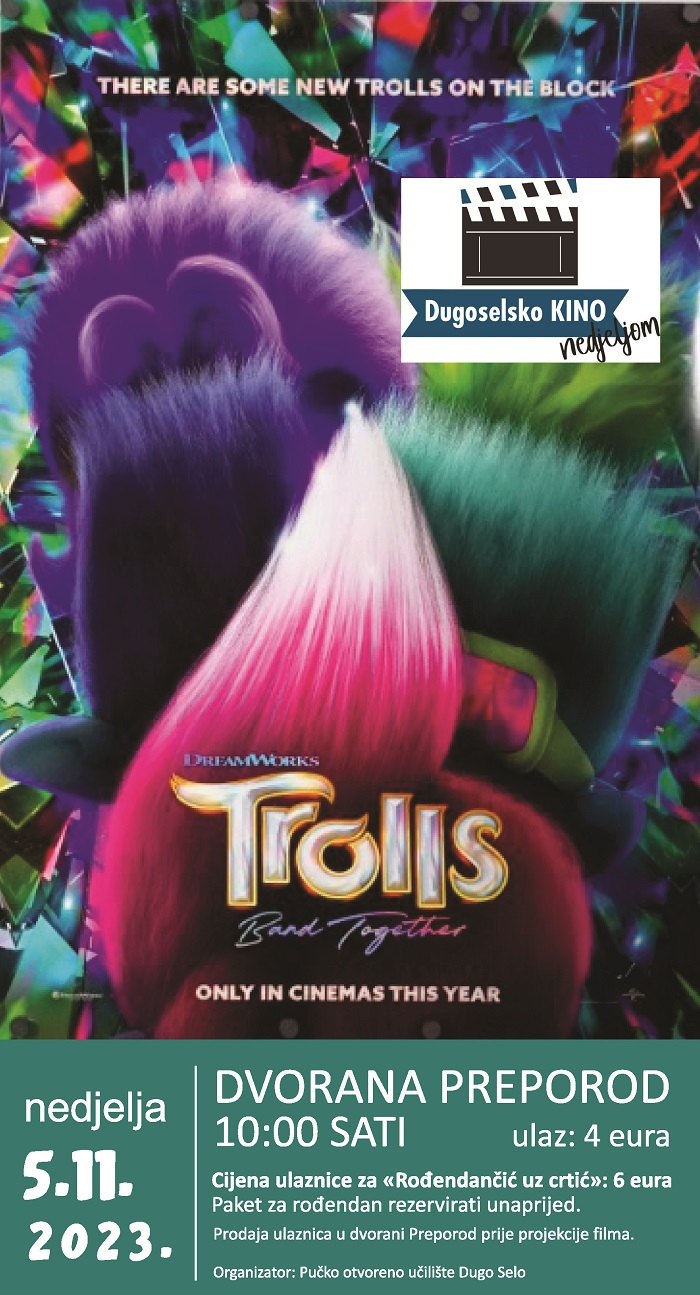 Zbog velikog interesa najmlađih gledatelja Dugoselsko kino nedjeljom ponovno prikazuje animirani film za djecu TROLOVI 3: BEND NA OKUPU, 5. studenog u 10 sati
