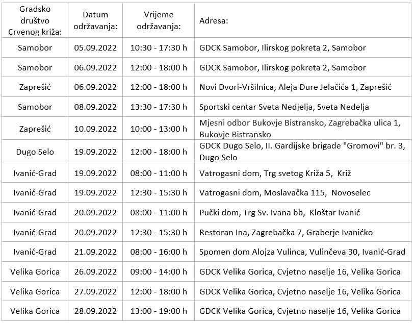 Društva Crvenog križa Zagrebačke županije tijekom rujna provodit će redovite akcije dobrovoljnog darivanja krvi na više lokacija. U GDCK Dugo Selo krv se može darivati 19.rujna od 12 do 18 sati.
