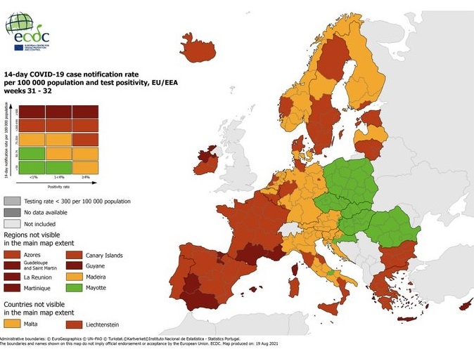 Epidemiološka karta ECDC-a za Europu objavljuje se svaki tjedan na temelju 14-dnevne incidencije i udjela pozitivnih testova u ukupnom broju testiranih.