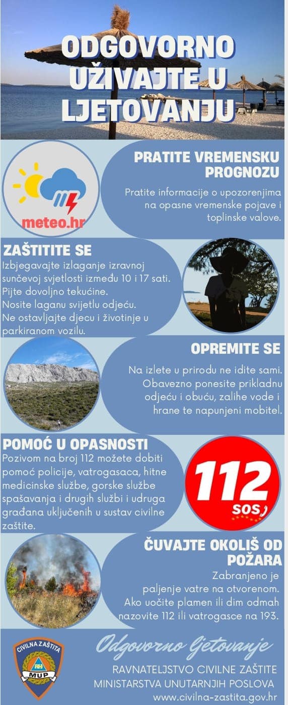 Preporuke Ravnateljstva civilne zaštite RH za sigurno ljetovanje Detalji Zagrebačka županija 04 Srpanj 2023 669 Ravnateljstvo civilne zaštite RH dalo je preporuke za sigurno ljetovanje. Sve možete pročitati u LETAK: ODGOVORNO LJETOVANJE hrv / eng