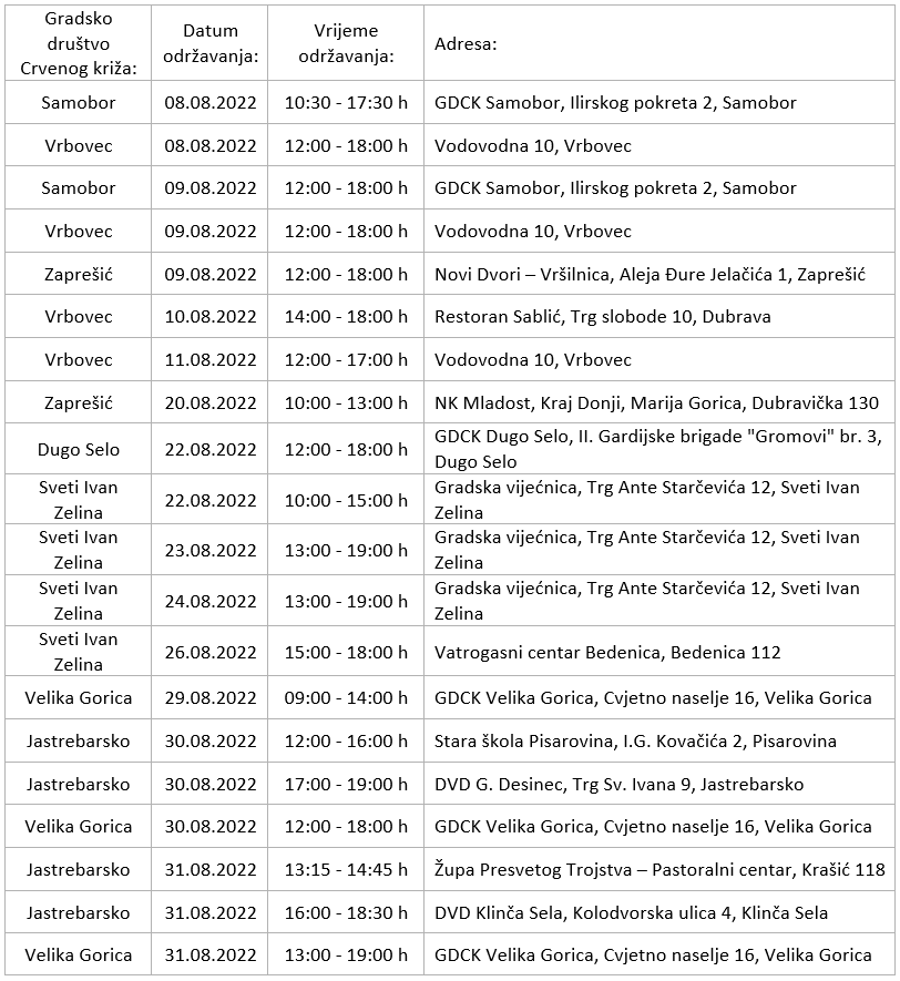 Društva Crvenog križa Zagrebačke županije tijekom srpnja provodit će redovite akcije dobrovoljnog darivanja krvi na više lokacija.