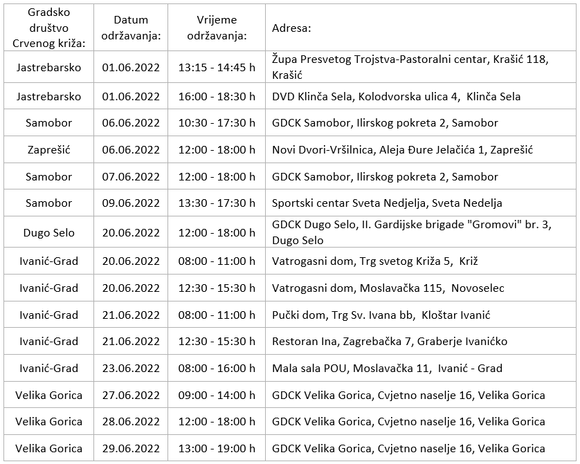Društva Crvenog križa Zagrebačke županije tijekom lipnja provodit će redovite akcije dobrovoljnog darivanja krvi na više lokacija.