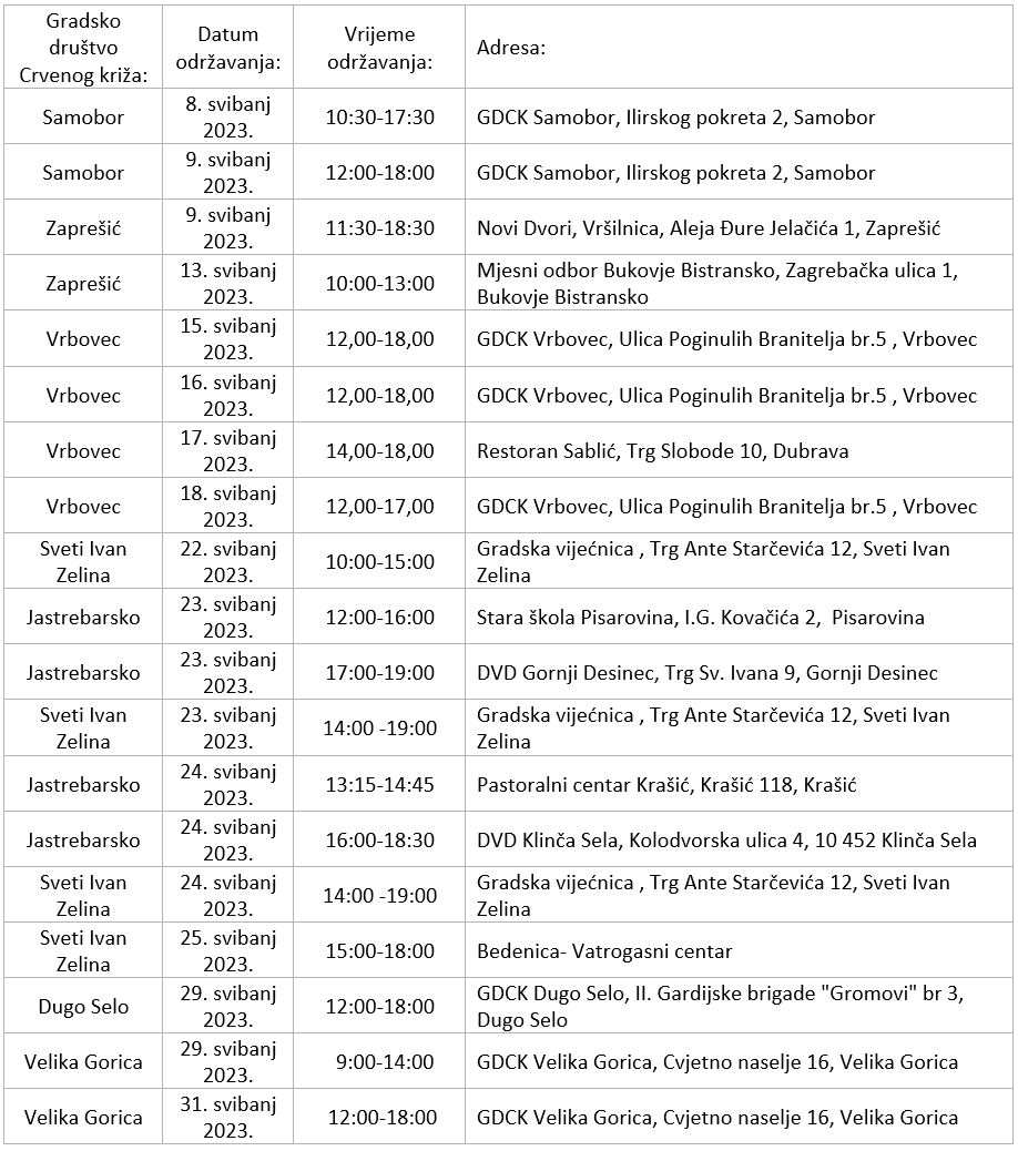 Društva Crvenog križa Zagrebačke županije tijekom svibnja provodit će redovite akcije dobrovoljnog darivanja krvi na više lokacija.