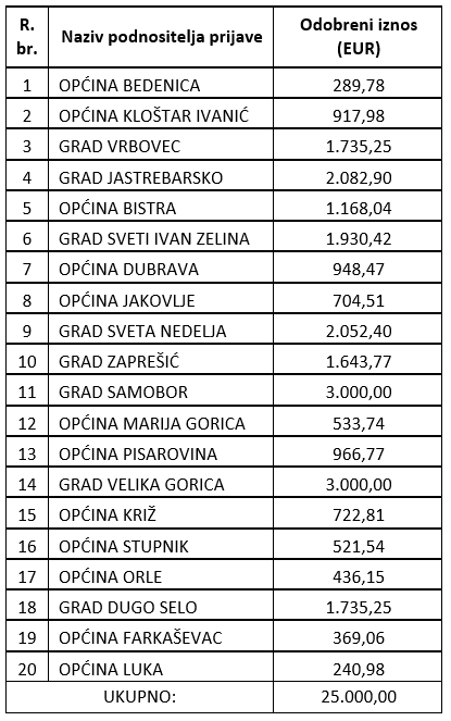 Na javni poziv, koji je bio otvoren od 11. veljače do 13. ožujka ove godine, od ukupno 34 javilo se 20 JLS-ova s područja Zagrebačke županije, odnosno 8 gradova i 12 općina. Među gradovima najveći iznos dobili su Velika Gorica i Samobor – 3.000,00 eura, a od općina Bistra – 1.168,04 eura.