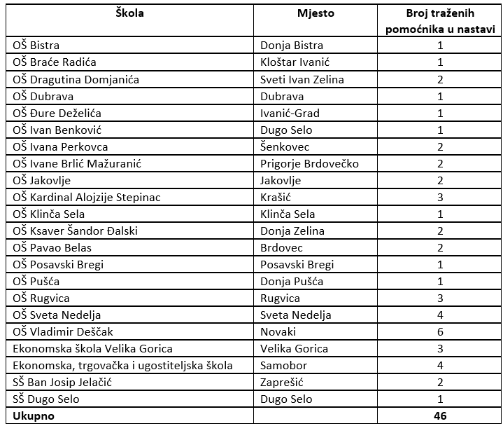 Osnovne i srednje škole s područja Zagrebačke županije, partneri u projektu Prsten potpore V., objavile su na svojim web stranicama dodatne natječaje za zapošljavanje pomoćnika u nastavi. Konkretno traži se 46 pomoćnika u nastavi, a zainteresirane kandidate se poziva da se prijave do 13. rujna 2022. godine.
