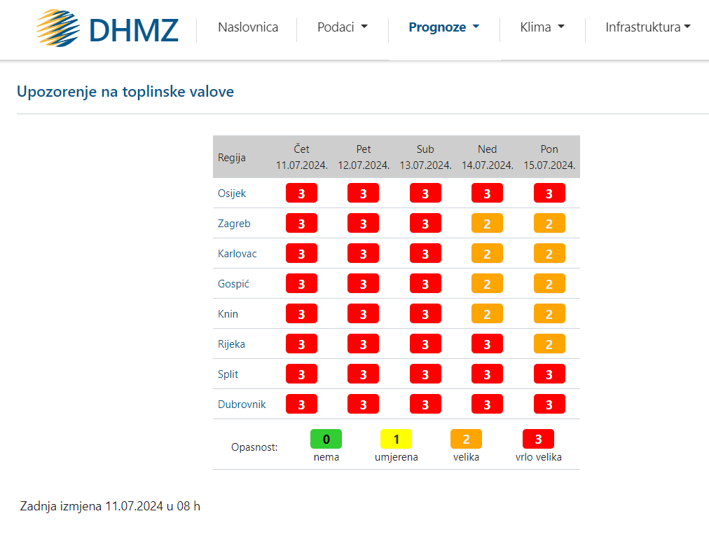 Državni hidrometeorološki zavod izdao je crveno upozorenje za cijelu zemlju. Toplinski val se nastavlja, a danas će ponovno biti sunčano i vrlo vruće. Najviša dnevna temperatura zraka za područje Zagrebačke regije kretat će se do 36°C. Za sutra i subotu su za cijelu zemlju objavljena upozorenja za iznimno visoku temperaturu. Iz DHMZ-a upozoravaju da je potrebno zbog iznimno visokih temperatura zaštititi sebe, djecu i starije te postupati prema savjetima danima od strane nadležnih tijela.